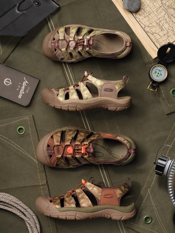 During my tenure at KEEN Footwear, I was able to work on seasonal color and material trend direction. Building in the heritage space of the outdoors while exploring the intersection with fashion, the color stories were made to appeal to the wide range of KEEN "fans". The first example shown here is the story "Outside In". The goal was to capture the spirit of bringing the outside in and be inspired by our own backyard - connecting our consumers to the nature around us through deep, natural tones with pops of safety orange and a sunshine yellow. Materials were selected to mimic nature in texture, nod to heritage outdoor, or lend sustainable fibers to the product. Showcasing the color and material story are the two colorways of the Smokey Bear x KEEN collection. The “S’mores” colorway brings in a Desert Sand and Ivory print paired with a light gum rubber colored outsole. The Olive colorway has a tonal Sage and Olive Drab print that gives the custom Smokey Bear toggle in Hot Orange a nice pop on the shoe. Both colorways have the same material mapping of a neoprene upper with recycled polyster webbing cage.